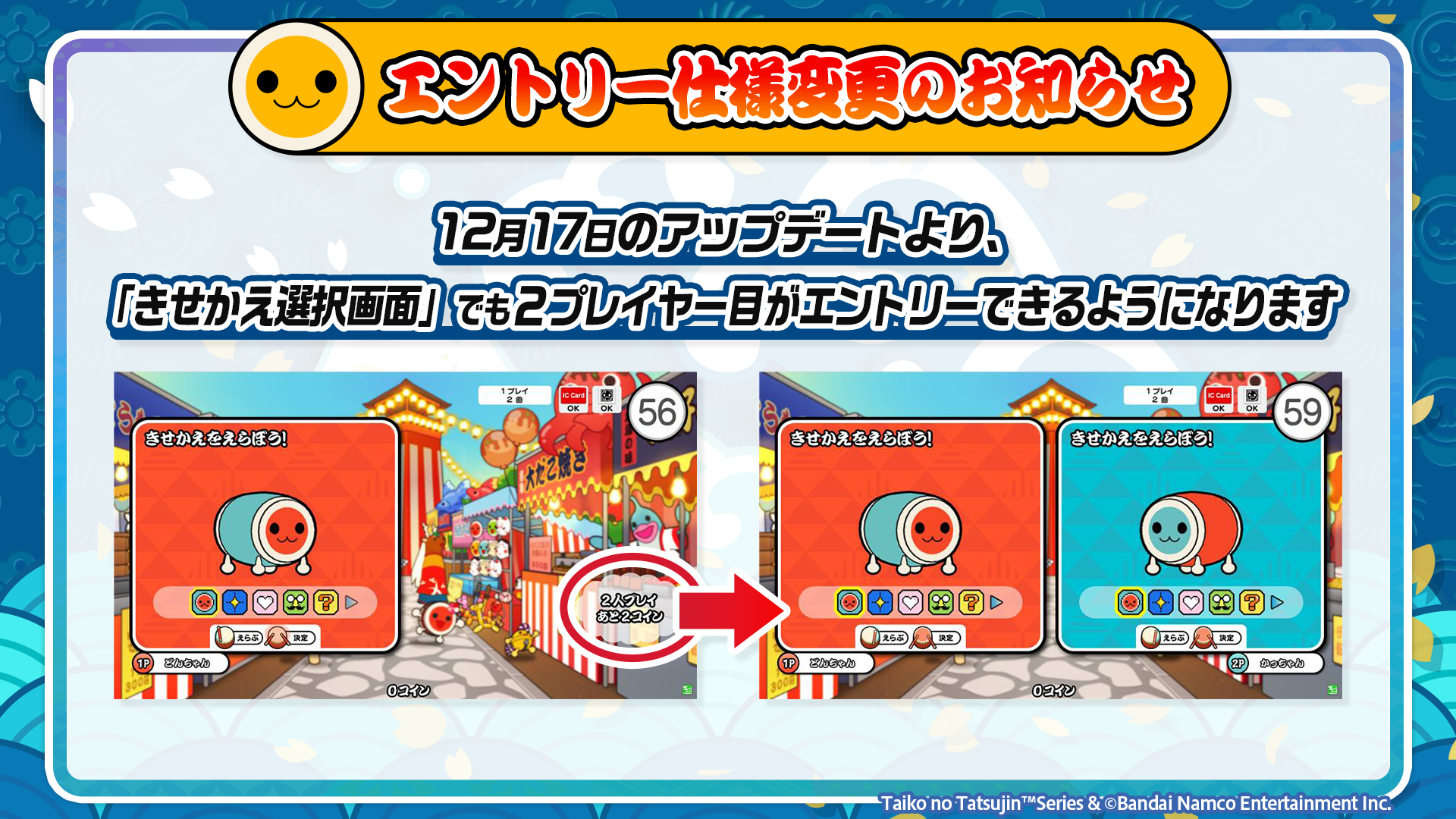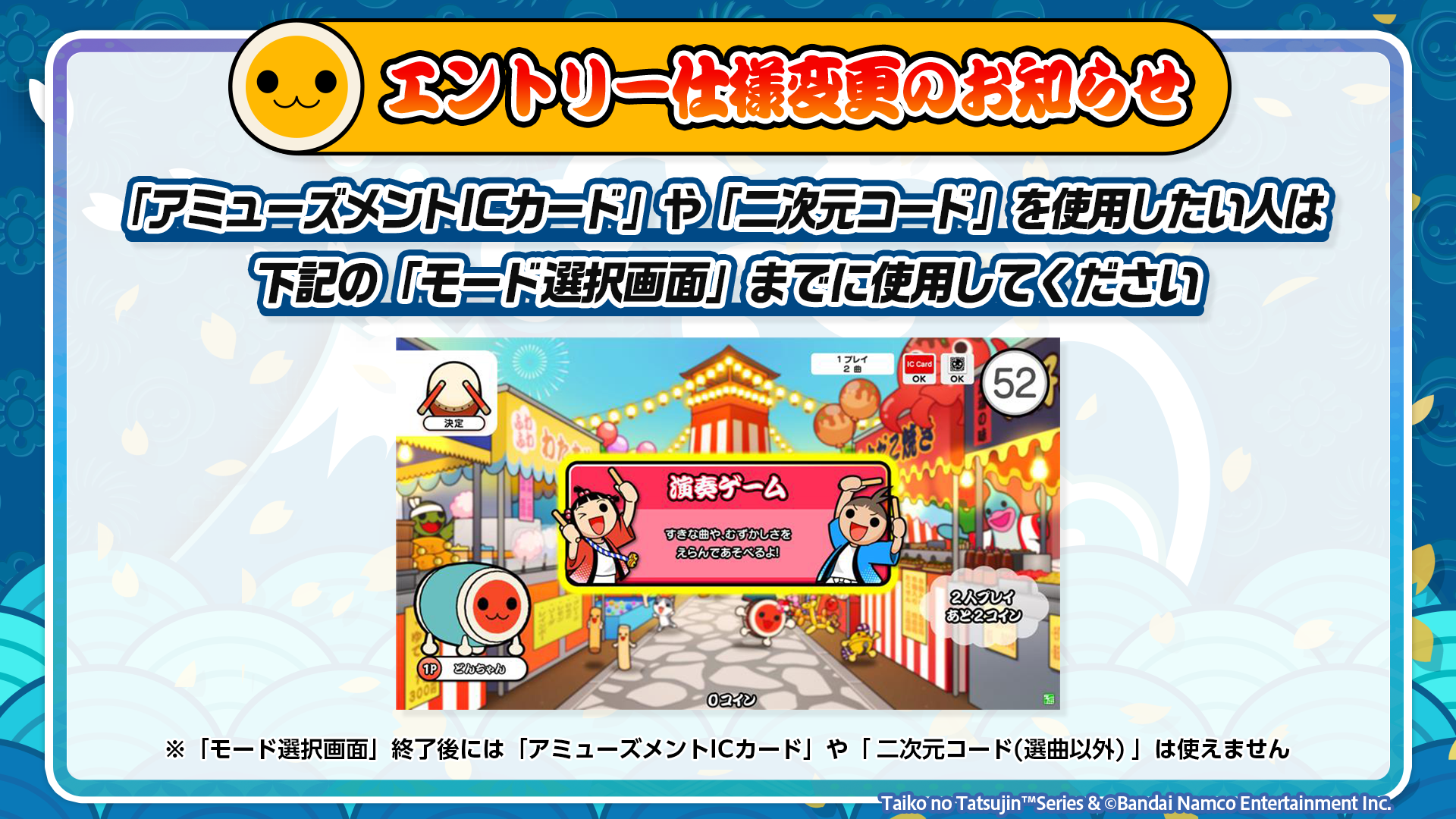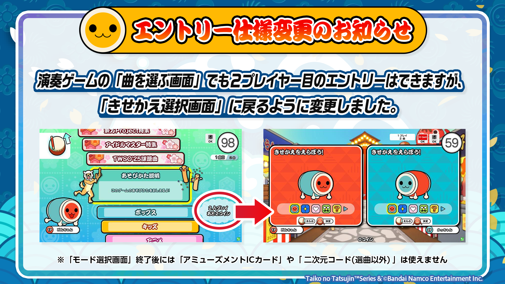 曲を選ぶ画面で2プレイヤー目がエントリーした場合、きせかえ選択画面に戻るようになったため、アミューズメントICカードや選曲以外の二次元コードは使えませんので、使用タイミングに気を付けてください!