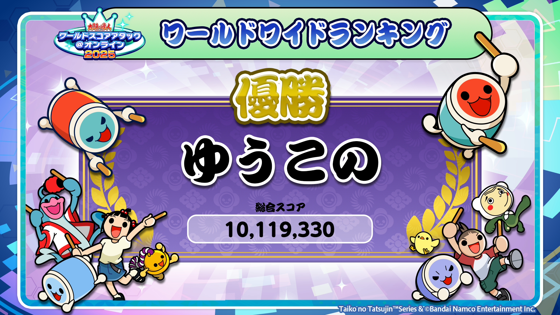 見事!「太鼓の達人 ワールドスコアアタック@オンライン 2025」の頂点にたったのは、ゆうこの選手です!