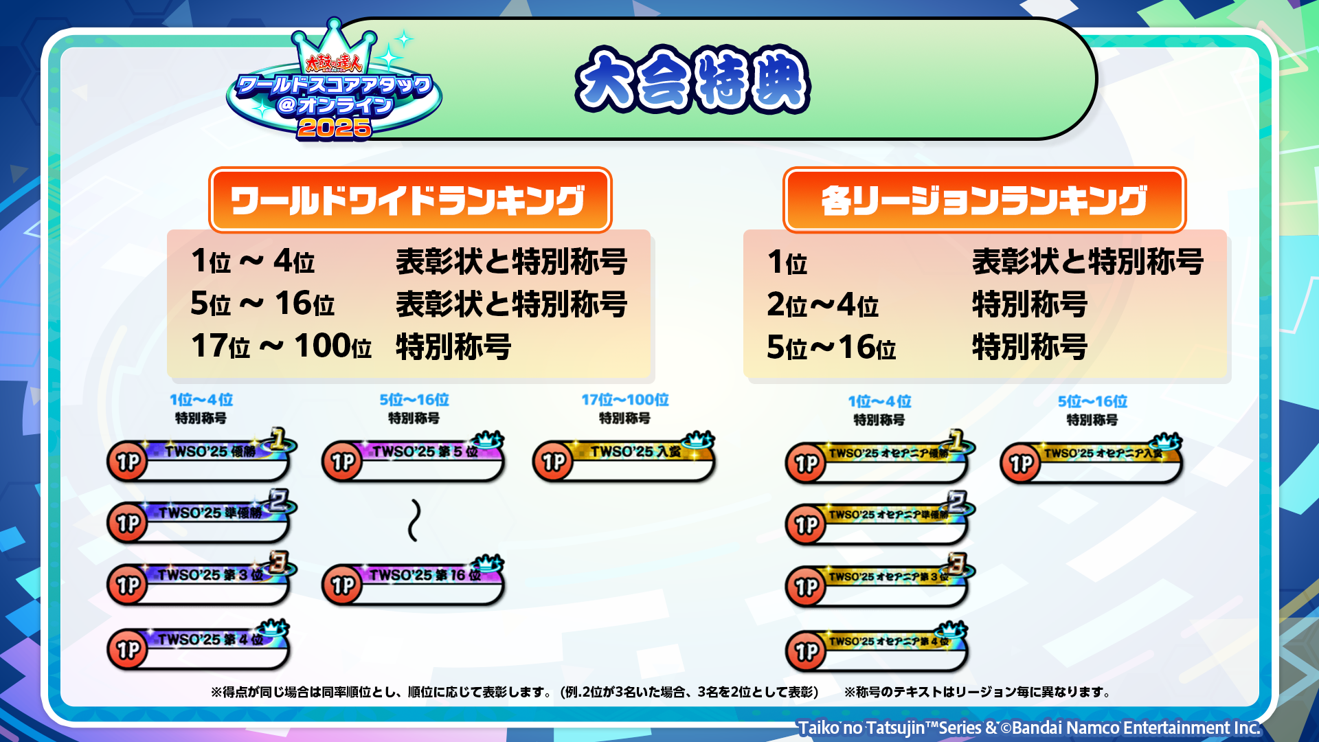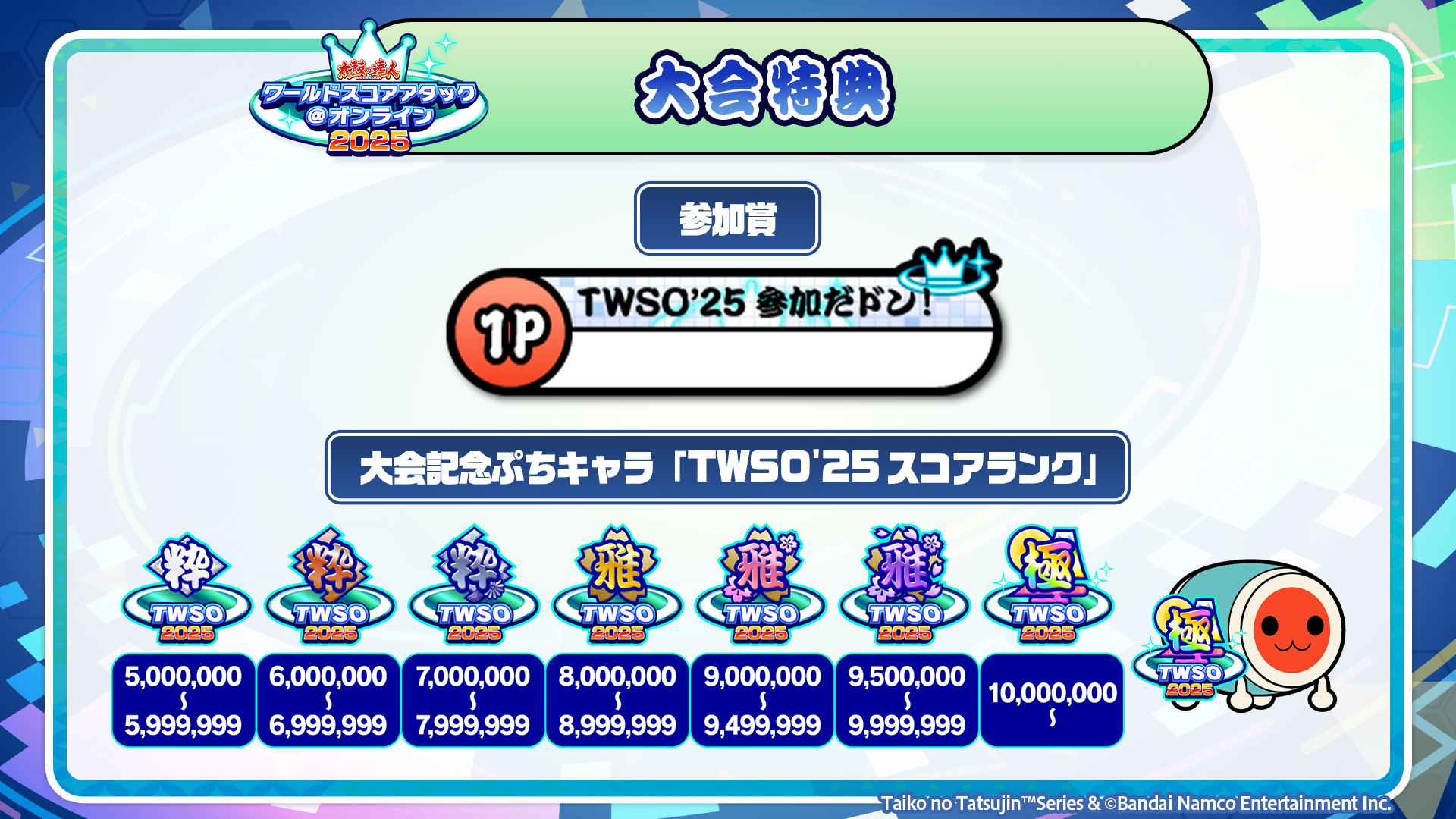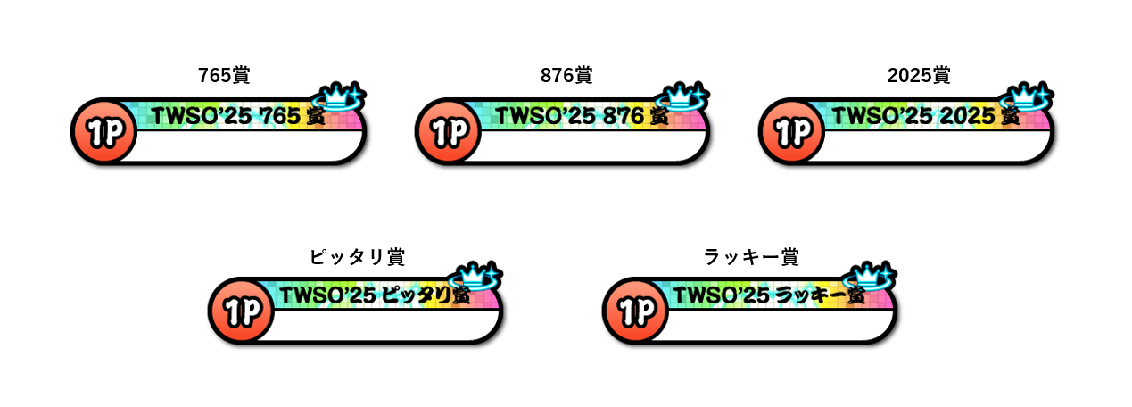 そして、ランキング順位関係なく、大会課題曲の最終総合獲得スコアが一定以上に達した方に、大会記念ぷちキャラ「TWSO’25 スコアランク」を配布します!