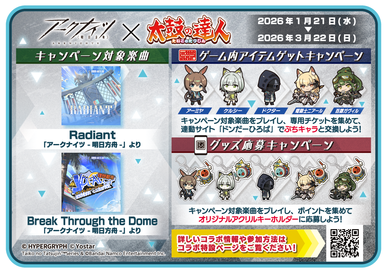 先日の生配信でもお知らせした「アークナイツ×太鼓の達人」コラボキャンペーンが、2026年1月21日(水)より全世界同時開催します!!